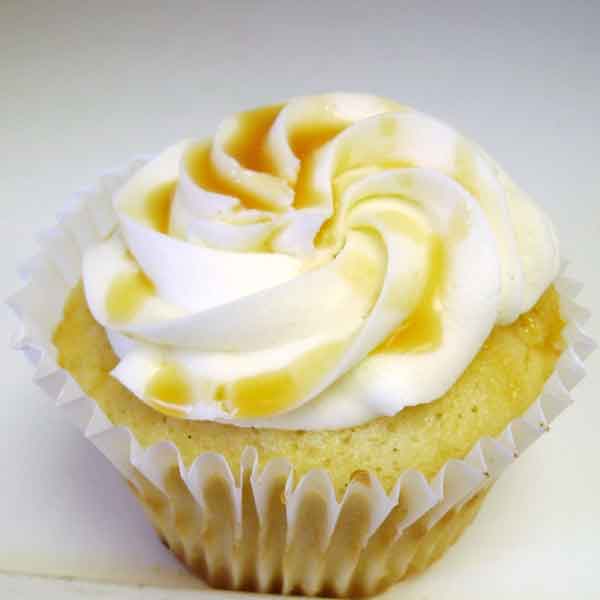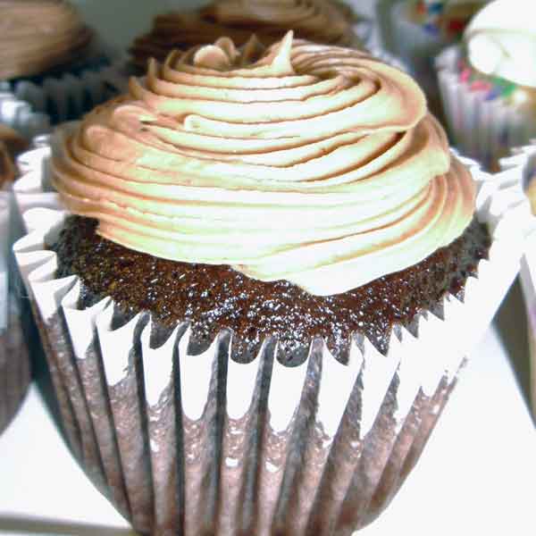 Moist mocha cupcakes, topped with decadent caramel, bourbon butter cream icing.