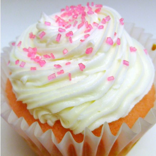 Peach Bellini cupcakes topped with peach champagne butter cream.
